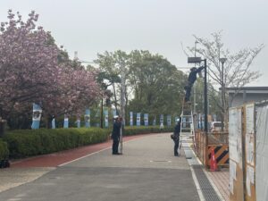 イベント終了後はすぐに撤去しないといけないので、既設の外灯と仮設のポールを立てて架空配線していきます。